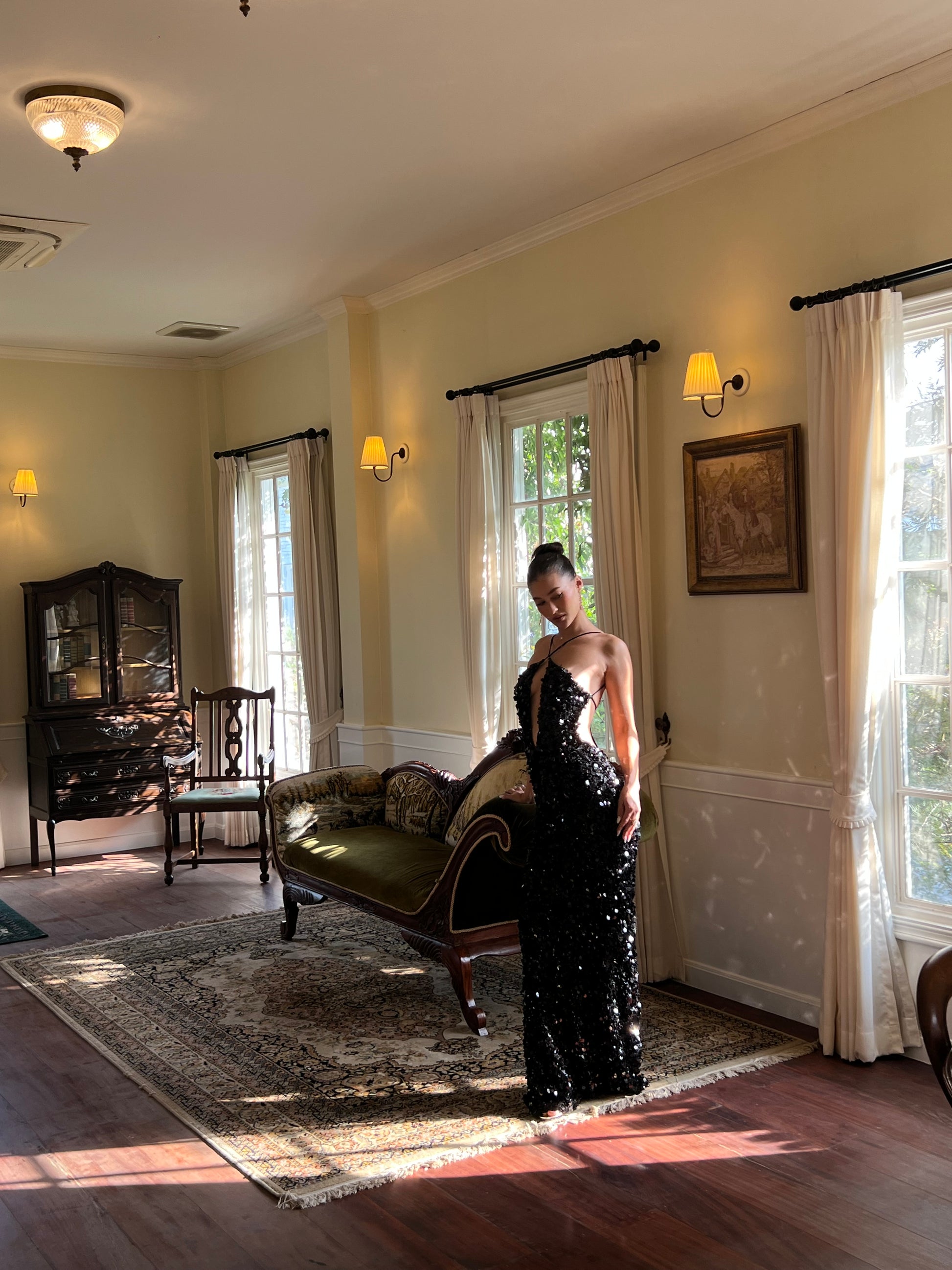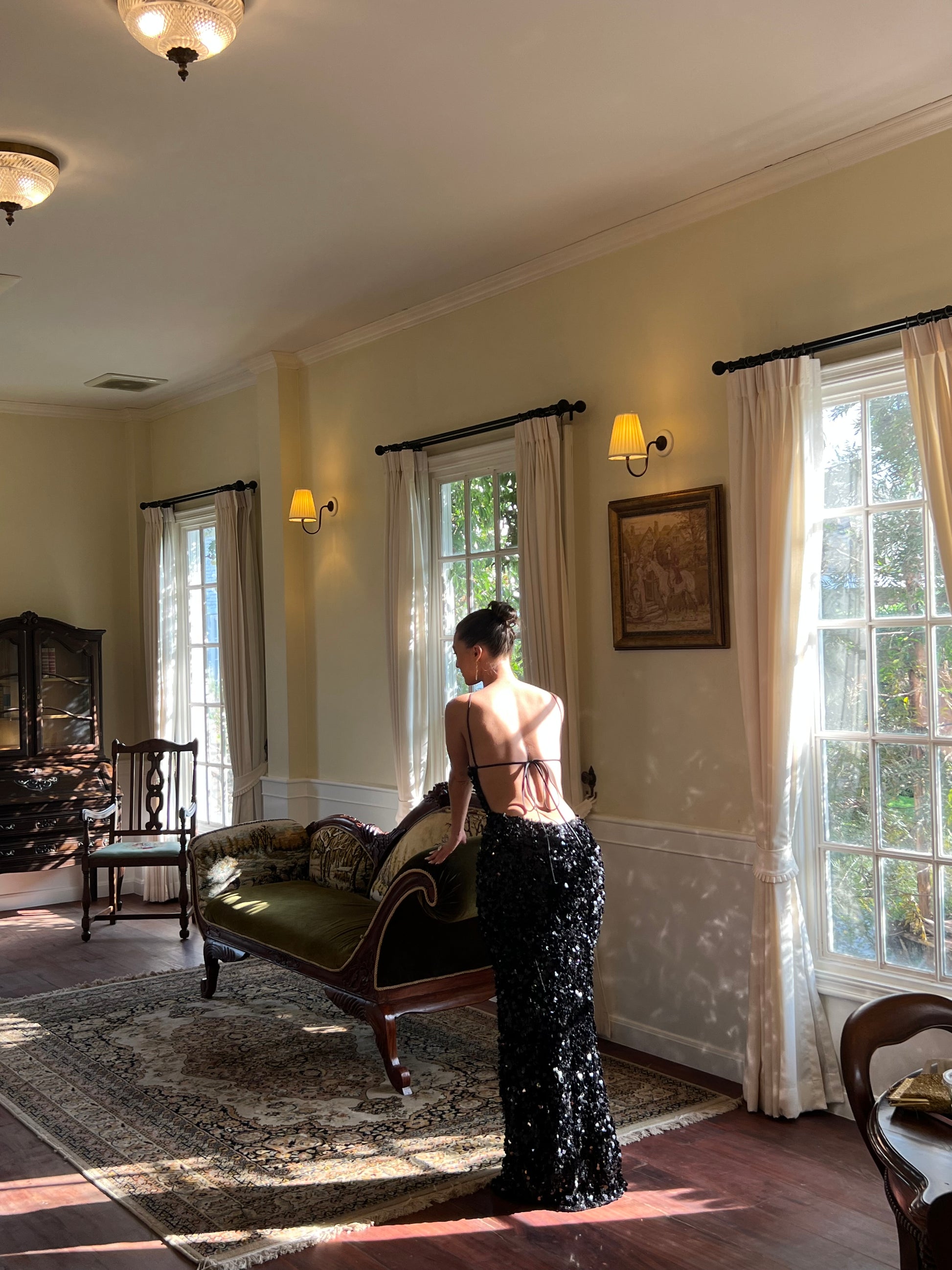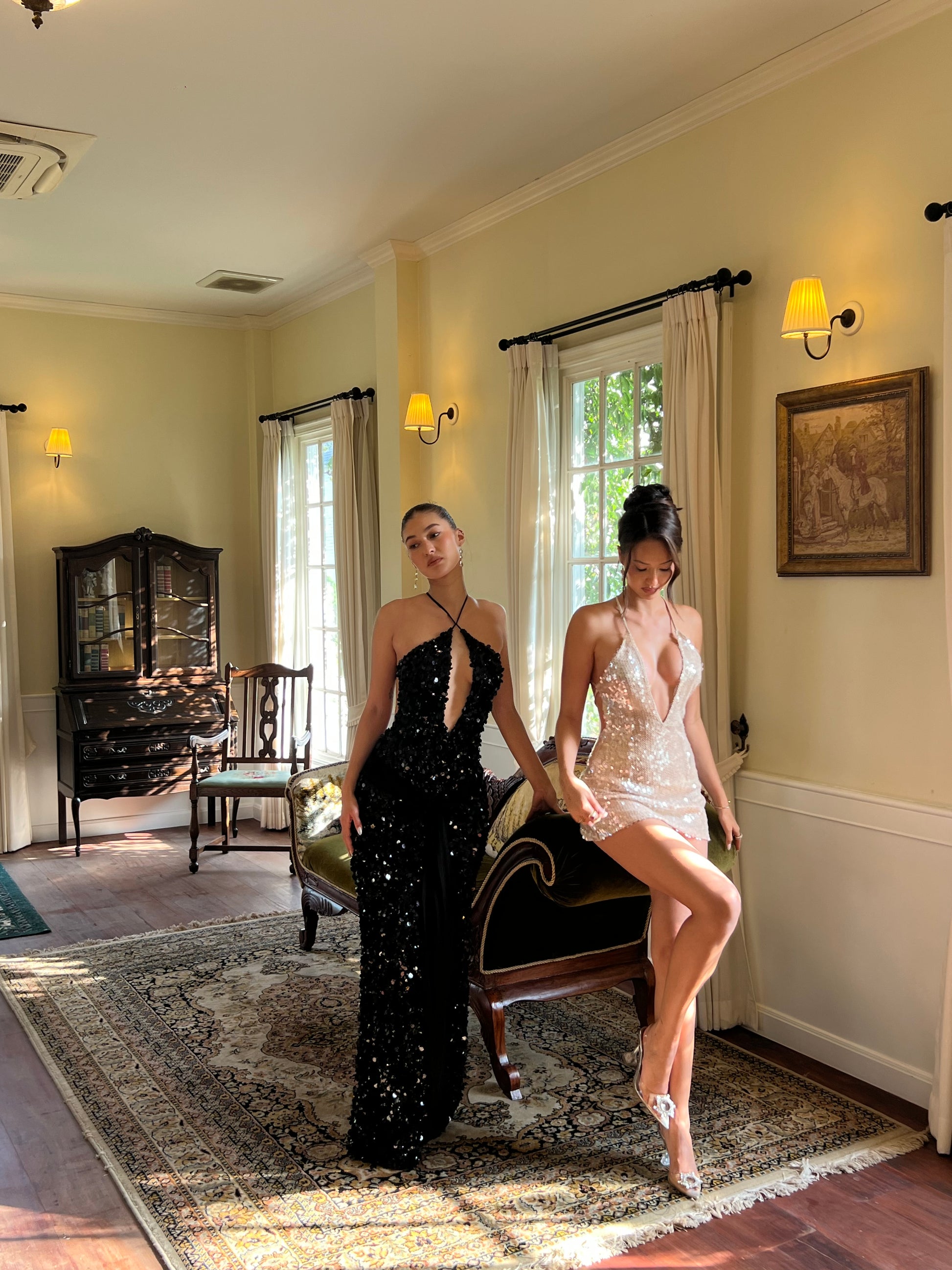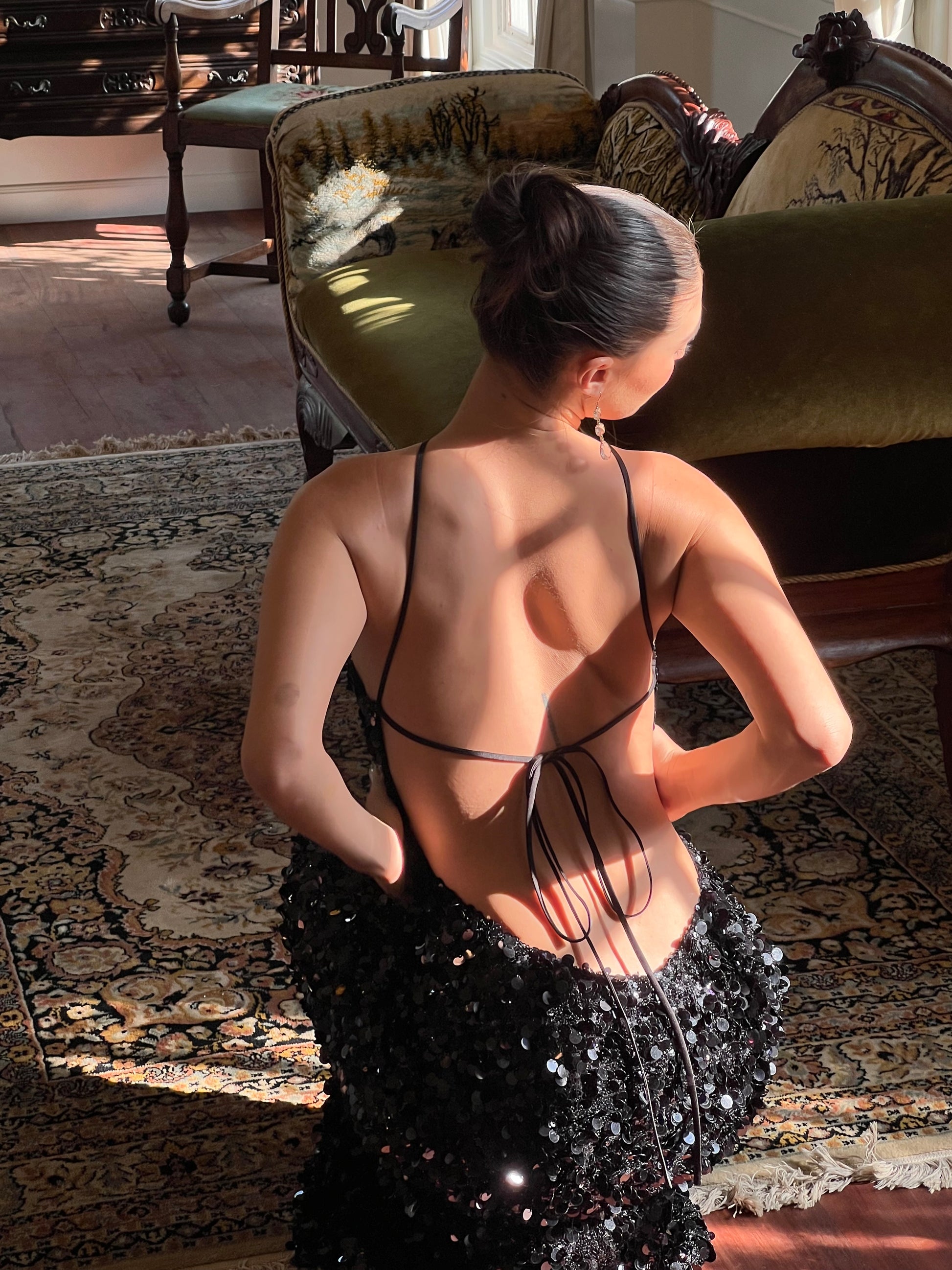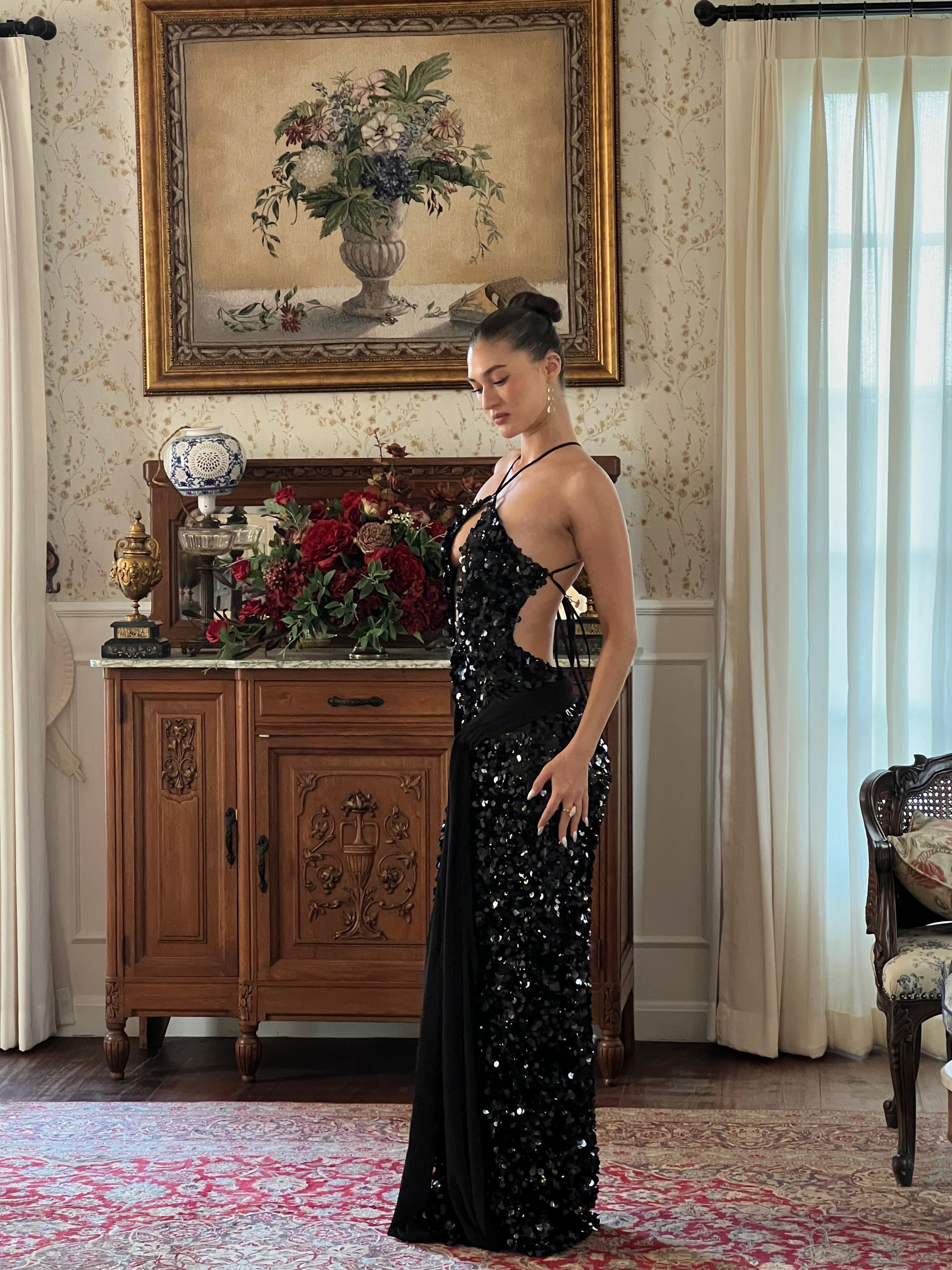 Meet Althea Maxi, a dramatic, floor-length version of our signature silhouette. Crafted from black sequins that catch the light with every movement, this dress features a deep plunging neckline and an open back with fine crossed straps and adjustable ties. The fitted shape skims the body, while the soft chiffon wrap detail at the waist adds contrast and fluidity.