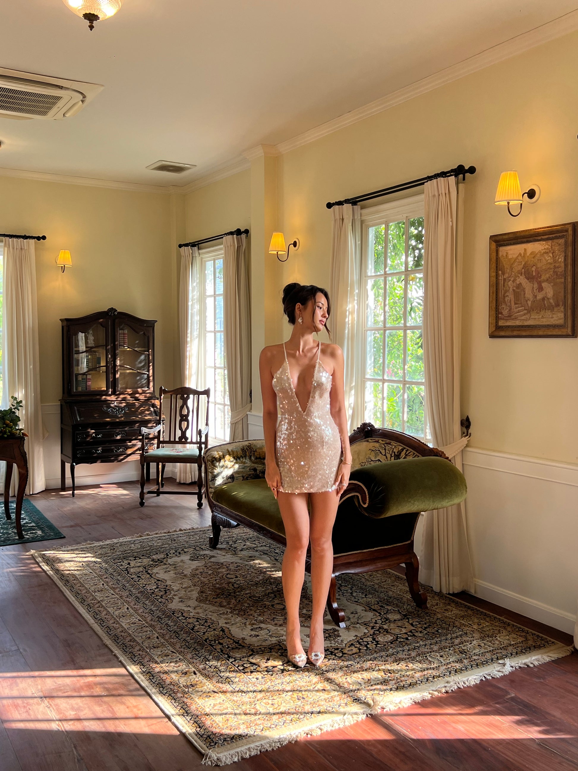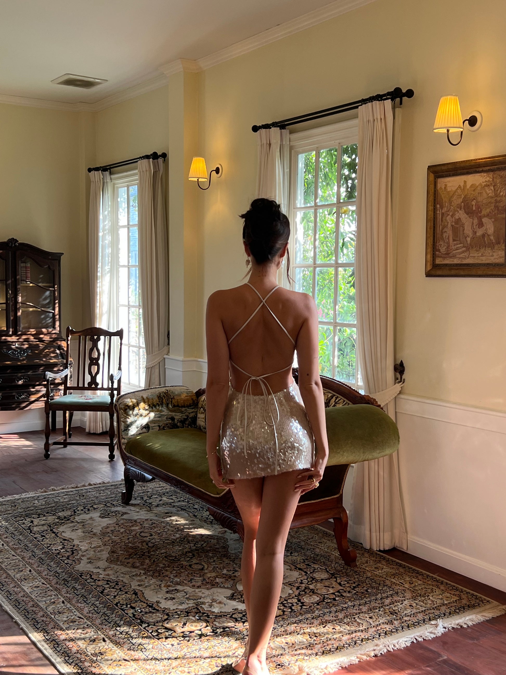 Meet Althea, a statement mini designed to catch the light and the eye. Crafted from shimmering sequins, this halter-style dress features a deep plunging neckline and a fitted silhouette that skims the body. The open back is finished with delicate crossed straps and adjustable ties, allowing for a personalised fit while keeping the look light and effortless.