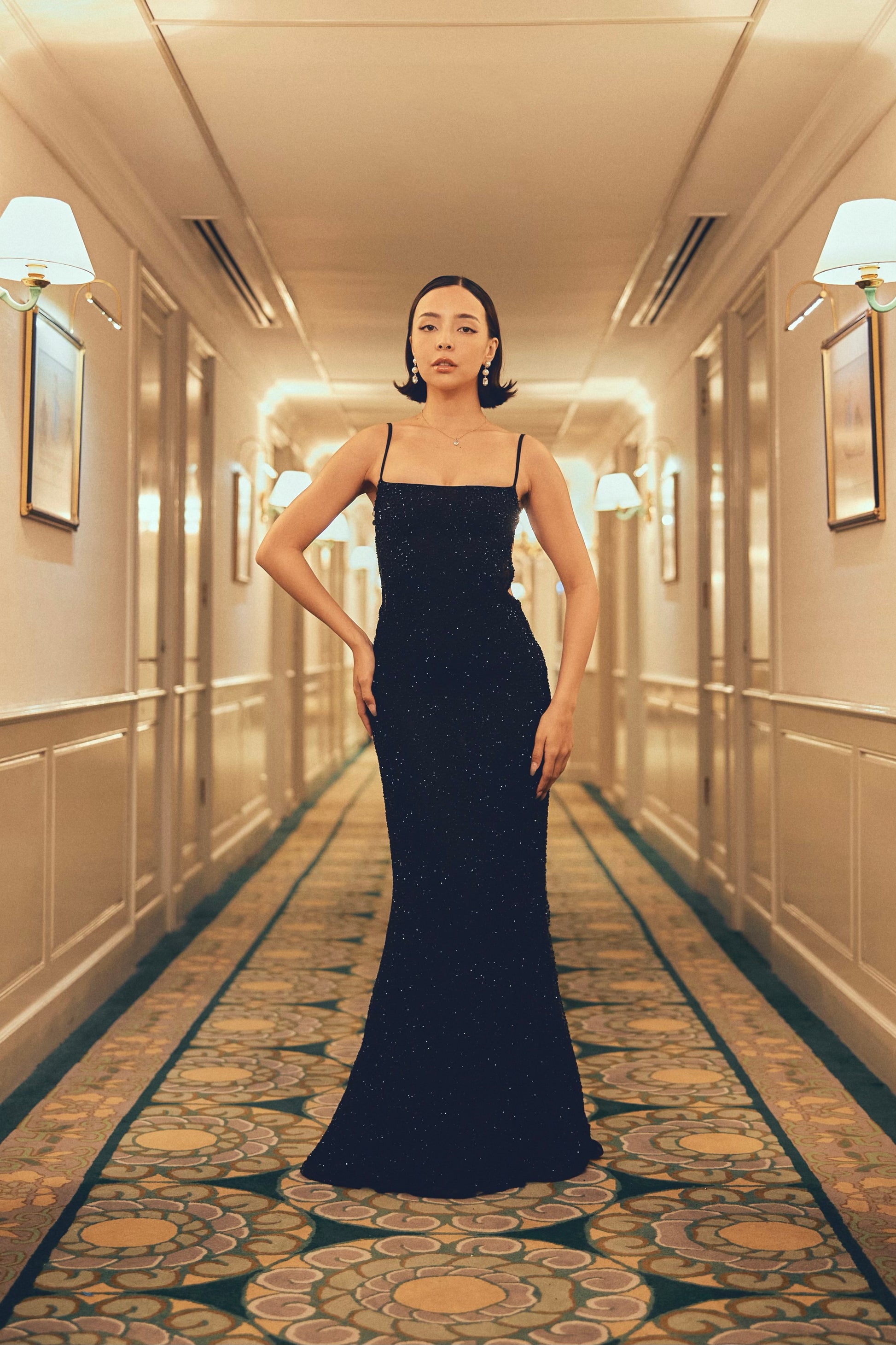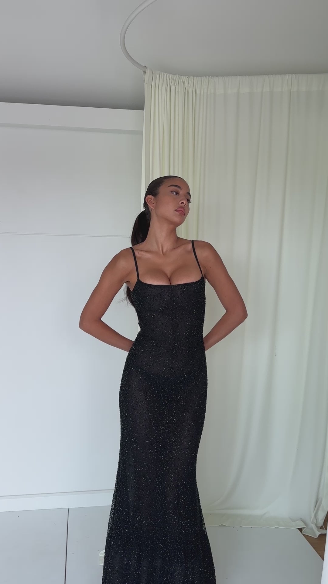 Introducing the Diana Maxi, a gown that embodies timeless sophistication. This bead-adorned gown boasts a form-flattering mermaid silhouette with adjustable straps and a seductive low back, ensuring a stunning silhouette.